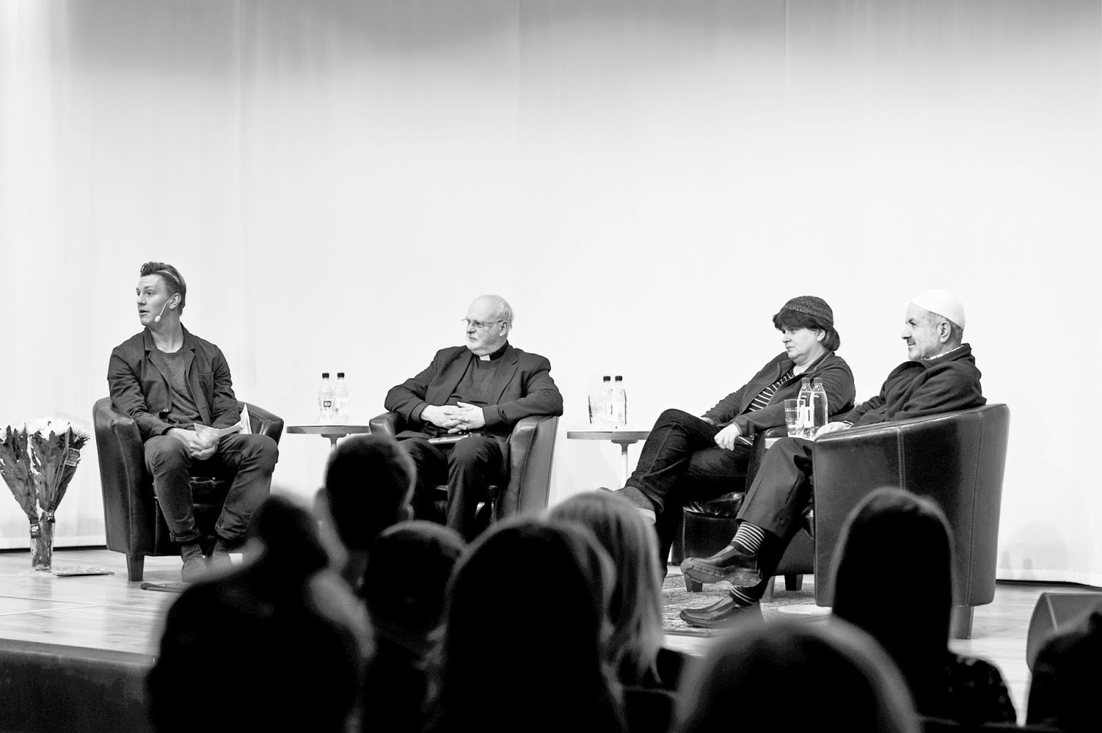 Den katolske biskopen Anders Arborelius, rabbinen för Stockholms synagoga Ute Steyer och imam Awad Olwan tog plats och välkomnades av församlingen.