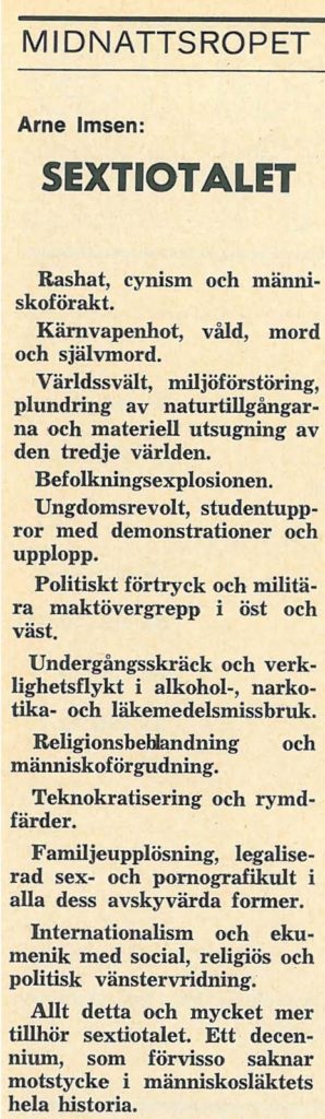 Faksimilen här intill publicerades i Midnattsropets första nummer år 1970. Frågorna som dominerade 60-talet var då i sin linda. Idag lever vi i dess slutskede. Tiden är kort. Orsaken till att Gud steg ned till Sodom och Gomorra på Abrahams tid var människornas nödrop. Idag hörs samma rop efter hjälp. Vi lever i en sista nådatid innan Jesus kommer. Låt oss använda den till att erbjuda människor vi möter Jesu frid. Något annat hopp finns inte.