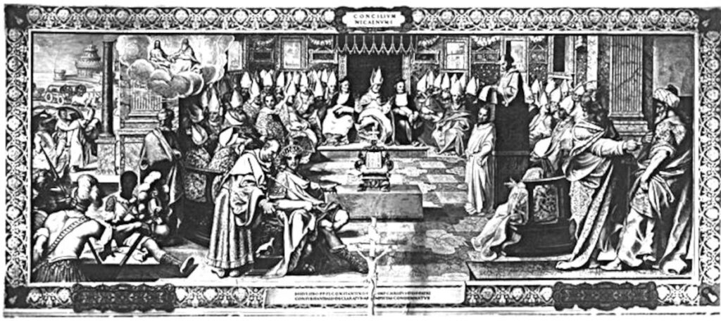 År 325 e.Kr. kallade kejsaren Konstantin den store (272–337 e.Kr.), den första kejsaren som bekände sig till den kristna tron, till ett koncilium i Nicaea, eftersom striden hade blivit så allvarlig att den hotade splittra kristenheten. På detta möte var nästan 300 biskopar från hela Romarriket närvarande, och de diskuterade hur man bäst skulle förstå Jesu natur. Var han av samma väsen (grekiska: homoousios) som Fadern, eller var han bara av liknande väsen (grekiska: homoioúsios) som Fadern. Även om de två orden bara hade en bokstavs skillnad, så utgjorde de en stor skillnad i hur man förstod Guds natur.