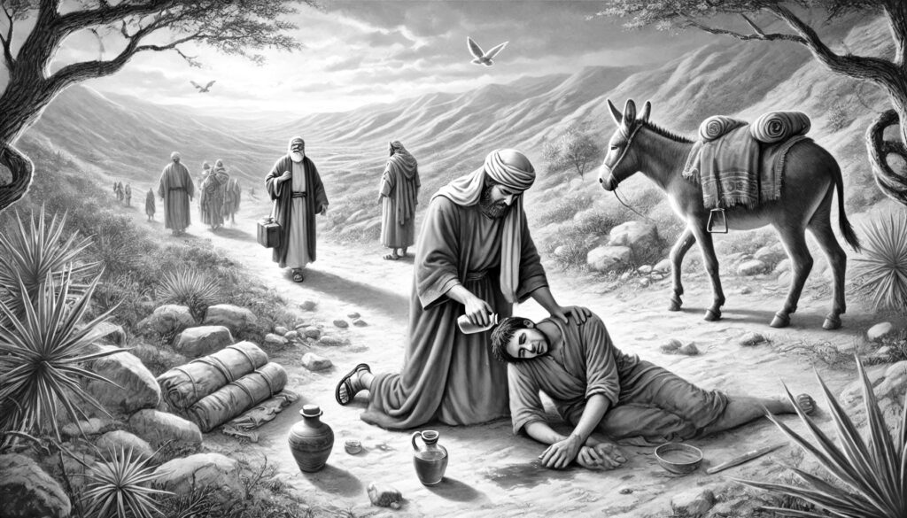 Så började tankarna arbeta i mitt inre: Tänk om den här mannen som låg där slagen hade skrapat ihop det sista av krafter och stolthet som han nu kunde ha kvar i sin situation och sagt: ”Nej tack rör inte mig!” Det hade inte varit så konstigt. Därför att den mannen som kom nu, det var en samarit. Och jag utgår ifrån att mannen som ligger i landsvägsdiket är en jude. För något annat är inte berättat. Så det hade ju kunnat finnas en liten hårsmån utav, låt oss kalla det för självbevarelsedrift hos den här mannen i diket, som hade fått honom att tacka nej till ett vidrörande av en samarit.