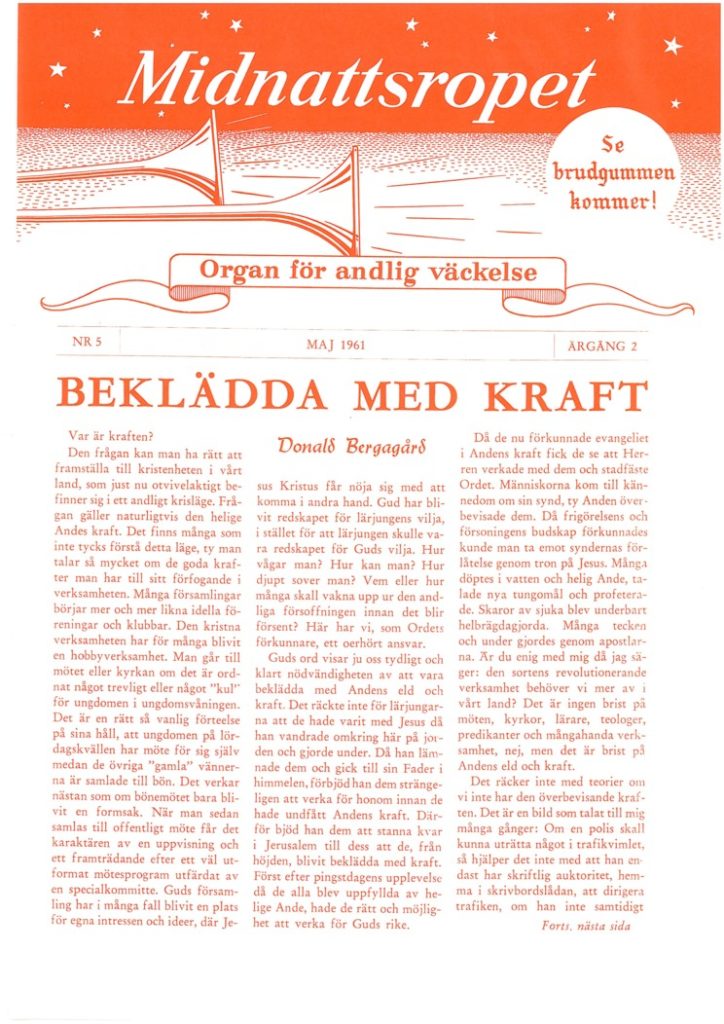 Ella Sörensen Den artikel av missionär Ella Sörensen, som vi tar oss friheten att införa här har tidigare varit publicerad i de norska tidningarna ”Korsets Seier” och ”M’ARAN ATAbladet”. Syster Sörensen har en mångårig missionsverksamhet på den norska pingstväckelsens fält i Afrika bakom sig. För någon tid sedan lämnade hon och hennes make, Olaf Sörensen, pingstsamfundet, och de står nu båda helt ett med den fria väckelse, som bryter fram i vårt västra grannland. Det är ett allvarligt väckelserop till Guds folk, som möter oss i denna artikel. Måtte den få bli många till uppvaknande och förnyelse. A. I. Väckelse ja, de som levde 1907 i pingstväckelsens första tid har berättat om vad de upplevde. Vi som kom efter dem kände att det brann i våra hjärtan, när de vittnade om sina upplevelser med Gud. Även på den tiden jag blev frälst brann elden. Ordet blev förkunnat i Andens kraft och överbevisning, och “jag fick uppleva att jag gick över från mörker till ljus mitt under en predikan. Det var en segrande förkunnelse. Det var liv och eld, det var allvar. Den helige Ande hade så stort rum i mötena, att han fritt fick utföra sitt verk, som aldrig kan ersättas av mänskliga medel, nämligen att överbevisa människor om synd, rättfärdighet och dom. Väckelse - pingstväckelse! Många väckelser har dragit fram över folk och länder innan pingstväckelsen kom. Pånyttfödelsen hade blivit levande och man ordnade församlingar med pånyttföldda själar. De troendes dop hade kornmit på sin rätta plats och man ordnade församlingar med pånyttfödda, troende och döpta Guds barn. Barndopet var en falsk lära, som icke fanns i Guds ond - och de, om blev överbevisade om dopet genom Guds ord, var inte rädda att framhålla sanningen och skilja sig från de andra. En vandring i helgelse blev levande och helgelseförsamlingar kom till. Helgelsesanningen blev levande. ”Utan helighet skall ingen se Gud”. Så kom pingstväckelsen. Vad var det som gav den sin särprägel? Jo, Andens dop! Ett dop i den helige Ande och eld. Låt oss inte glömma elden, den bränner bort allt som är av hö och strå. Med Andedopet följde kraft ”När den helige Ande kommer över eder, skolen I unxdfå kraft och bliva mina Vittnen.” Apg. 1:8. Andens dop är inte bara att tala i tungor. Det är kraft till liv och tjänst, kraft till att göra under och tecken i Jesu namn. Paulus skriver i sitt brev till församlingen i Korint (1 Kor. 2 15): ”Och mitt tal och min predikan framställes icke med övertalande visdomsord, utan med en bevisning i Ande och kraft.” Apostlarna mottog kraft för att kunna göra trons gärningar., Jesus började med att GÖRA och LÄRA, och apostlarna hade samma verksamhetsmetod. Läser vi hela Apostlagärningarna skall vi finna, att de verkade trons gärningar. De förkunnade inte bara trons gärningar som en lära utan de gick ut och förkunnade Ordet överallt och Herren verkade med dem genom att stadfästa Ordet med åtföljande tecken. Mark. 16:20. Det var väckelse och rörelse. Gud var med och det var så märkbart att fruktan kom över var och en. .Apg 2:43. Och många under och tecken gjordes genom apostlarna. De hade ett hjärta och en själ och stor nåd var över dem alla. De kunde bära fram vittnesbördet om Herren ]esus Kristus med stor frimodighet och kraft. Falskhet och synd blev uppenbarad. Apg 5. Därför kom stor fruktan över församlingen, och det sporrade dem att leva helt för Gud och vandra i helighet inför honom.. Därför vågade ingen av ”de andra” hålla sig till dem, men folket höll dem i stor ära. Apg. 5:13. De hade en sådan helighet, en sådan kraft, ett sådant liv i Gud avskilda från världen, att ”de andra” icke vågade närma sig dem. Men folket, de som längtade efter Gud och hans hjälp, de höll dem i stor ära. Vilken makt *den första församlingen hade! Vilken skillnad det var mellan den och världen! Ett utvalt släkte, ett konungsligt prästerskap, ett heligt folk, Guds egendomsfolk. 1 Pet. 2:9. De är i världen, men icke av världen. De brukar världen som de icke brukade den, eftersom denna världens skapelse förgår. Församlingen är en brud, en tillsluten lustgård, en förseglad källa och en stängd brunn. H. V. 4:12. Världen känner oss icke, eftersom den icke har lärt känna honom. 1 Joh. 3:1. Var är skillnaden idag? Vi har sannerligen kommit in i en kris! Djävulen är mycket upptagen med att modernisera Guds församling. Det är det enda sätt på vilket han kan få föra in synd och världslighet, sudda ut gränserna och få sådana ting, som var synd för oss att se lovliga och oskyldiga ut. Det är det samma, som han gjort i alla tider. För vi blundar väl icke för, att alla de församlingar, som existerar i dag och har en allmänt vedertagen god förkunnelse, en gång har varit gripna av gudsuppenbarelsen i Ordet, en gång varit som brinnande eldfacklor för dåtidens människor. När så elden 1?örjade slockna och uppenbarelsens Ande inte längre hade rum i deras mitt, var de icke vakna nog att röja bort det som hindrade Gud från att verka. Eller var de inte villiga att betala priset för att kunna behålla livsglöden och uppenbarelsens Ande? Detta är en livsbetingelse för att Guds församling skall bli vad Gud har menat att den skall vara på jorden, nämligen en förmedlare av Guds mångfaldiga Visdom. Ef. 3:10. Så bytte de bort Guds ord mot sina egna ritualer. Och i stället för att gå Guds väg går de sina egna vägar. I stället’ för Gudsuppenbarelsen i Ordet, fick det interlektuella plats, och i stället för spontan Gudsuppenbarelse i mötena, utarbetade mänskliga hjärnor sina egna ideer och meningar. I stället för sång i Anden tog psalmsång, mässor och ”Fader vår” hela platsen. Missförstå mig icke! Fader vår och psalmsång är heliga och dyrbara ting och hör hemma bland de troende, men om det användes för att skyl