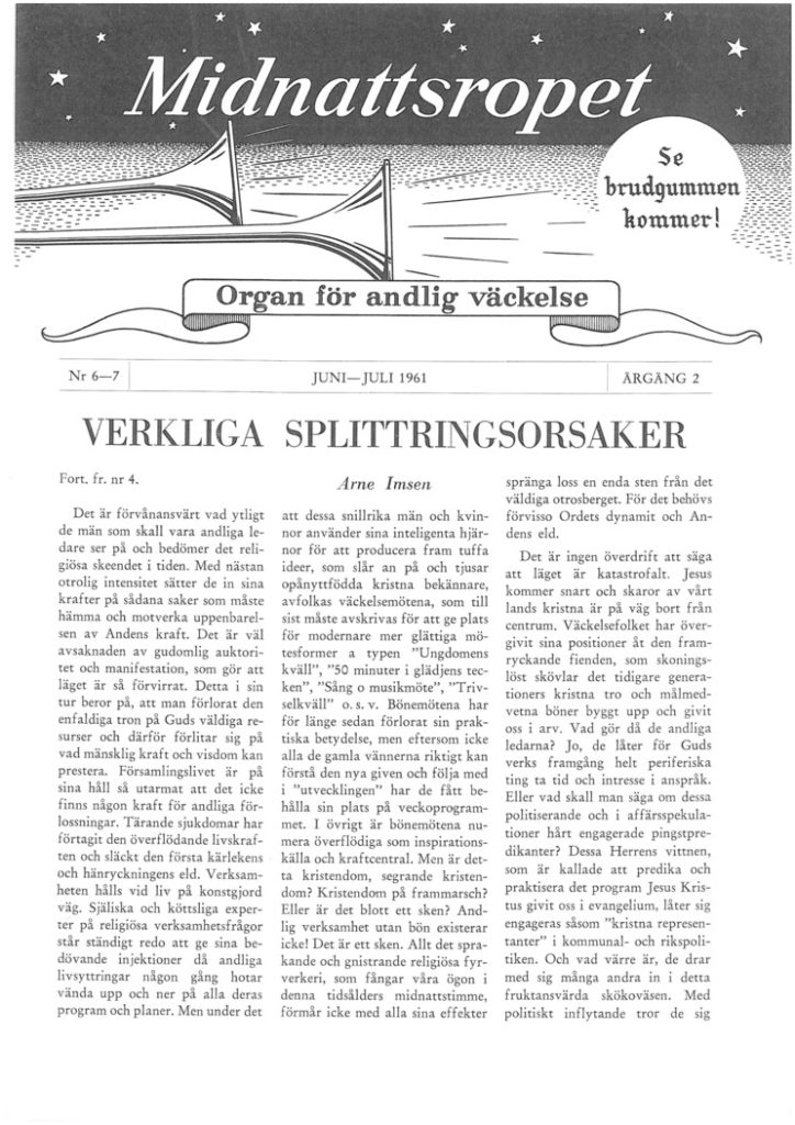 Arne Imsen Fort. fr. nr 4. Det är förvånansvärt vad ytligt de män som skall vara andliga ledare ser på och bedömer det religiösa skeendet i tiden. Med nästan otrolig intensitet sätter de in sina krafter på sådana saker som måste hämma och motverka uppenbarelsen av Andens kraft. Det är väl avsaknaden av gudomlig auktoritet och manifestation, som gör att läget är så förvirrat. Detta i sin tur beror på, att man förlorat den enfaldiga tron på Guds väldiga resurser och därför förlitar sig på vad mänsklig kraft och visdom kan prestera. Församlingslivet är på sina håll så utarmat att det icke finns någon kraft för andliga förlossningar. Tärande sjukdomar har förtagit den överflödande livskraften och släckt den första kärlekens och hänryckningens eld. Verksamheten hålls vid liv på konstgjord väg. Själiska och köttsliga experter på religiösa verksamhetsfrågor Står ständigt redo att ge sina bedövande injektioner då andliga livsyttringar någon gång hotar vända upp och ner på alla deras program och planer. Men under det att dessa snillrika män och kvinnor använder sina intelligenta hjärnor för att producera fram tuffa ideer, som slår än på och tjusar opånyttfödda kristna bekännare, avfolkas väckelsemötena, som till sist måste avskrivas för att ge plats för modernare mer glättiga mötesformer a typen ”Ungdomens kväll”, ”50 minuter i glädjens tecken”, ”Sång o musikmöte”, ”Trivselkväll” o.s.v. Bönemötena har för länge sedan förlorat sin praktiska betydelse, men eftersom icke alla de gamla vännerna riktigt kan förstå den nya given och följa med i ”utvecklingen” har de fått behålla sin plats på veckoprogrammet. I övrigt är bönemötena numera överflödiga som inspirationskälla och kraftcentral. Men är detta kristendom, segrande kristendom? Kristendom på frammarsch? Eller är det blott ett sken? Andlig verksamhet utan bön existerar icke! Det är ett sken. Allt det sprakande och gnistrande religiösa fyrverkeri, som fångar våra ögon i denna tidsålders midnattstimme, förmår icke med alla sina effekter spränga loss en enda sten från det väldiga otrosberget. För det behövs förvisso Ordets dynamit och Andens eld. Det är ingen överdrift att säga att läget är katastrofalt. Jesus kommer snart och skaror av vårt lands kristna är på väg bort från centrum. Väckelsefolket har övergivit sina positioner åt den framryckande fienden, som skoningslöst skövlar det tidigare generationers kristna tro och målmedvetna böner byggt upp och givit oss i arv. Vad gör då de andliga ledarna? Jo, de låter för Guds verks framgång helt periferiska ting ta tid och intresse i anspråk. Eller vad skall man säga om dessa politiserande och i affärsspekulationer hårt engagerade pingstpredikanter? Dessa Herrens vittnen, som är kallade att predika och praktisera det program Jesus Kristus givit oss i evangelium, låter sig engageras såsom ”kristna representanter” i kommunal och rikspolitiken. Och vad värre är, de drar med sig många andra in i detta fruktansvärda skökoväsen. Med politiskt inflytande tror de sig kunna skapa ett kristet samhälle. Alltså skall mer eller mindre antikristligt influerade politiska organisationer i samarbete med fria församlingars föreståndare och andliga ledare, åstadkomma det, som Bibeln framhåller som en fullständig omöjlighet. Dessa samhällsreformatoriska strävanden har ingen hemortsrätt i Bibeln, där det klart framhållas att den kristne är en gäst och främling på jorden. Sin uppgift som världens salt och ljus fyller församlingen bäst, då hon lever i avskild och vakande ställning. Då kommer hon också att sätta djupa spår efter sig i den närvarande tiden och kunna rädda många ut ur denna tidsålders fåfängliga väsende. ”Tiden är kort. Därför må härefter de som hava hustrur vara, såsom hade de inga, och de som gråta, såsom gräte de icke, och de som glädja sig, såsom gladde de sig icke, och de som köpa något, såsom finge de icke behålla det, och de som bruka denna värld, såsom gjorde de icke något bruk av den. Ty den nuvarande världsordningen går mot sitt slut”. 1. Kor 7:2931. Hela kyrkohistorien visar, att det är då de kristna förlorat sin andliga kraft som de plottrat bort sig i inomvärldsliga reformsträvanden. Men skulle det nu till äventyrs vara så, att församlingens grundare och uppdragsgivare hade menat att arvtagarna skulle ha också en sådan målsättning, då måste apostlarna och den första generationen kristna fullständigt missförstått hans avsikter. Var i apostlagärningarna eller i breven kan vi utläsa några sådana ambitioner? Det är en sida av denna sak. Sedan kan man ju fråga sig, om det är tänkbart, att apostlarna hade så liten tro på den helige Andes kraft och förvandlande makt, så att de skulle gått i ok med världsliga storheter för att befrämja kristendomens sak. ”Gån icke i ok tillsammans med dem som icke tro. Det bleve omaka par. Vad har väl rättfärdighet att skaffa med orättfärdighet, eller vilken gemenskap har ljus med mörker. Huru förlika sig Kristus och Beliar, eller vad delaktighet har den som tror med den som icke tror? Eller huru låter ett Guds tempel förena sig med avgudar? Vi äro ju ett den levande Gudens tempel, ty Gud har sagt: ”jag skall bo i dem och vandra ibland dem. Jag skall vara deras Gud, och de skola vara mitt folk.” Alltså: gån ut ifrån dem och skiljen eder ifrån dem”, säger Herren. Kommen icke vid det orent är. Då skall jag taga emot eder och vara en Fader för eder, och I skolen vara mina söner och döttrar”, säger Herren, den Allsmäktige.” I dag ignorerars dessa apostoliska förmaningar till stor skada för Guds verk. Visar icke detta, att man har större tro på världsliga maktmedel än på de väldiga vapen Gud givit åt sin församling. Dessa tendenser avspeglar sig allt tydligare i förs