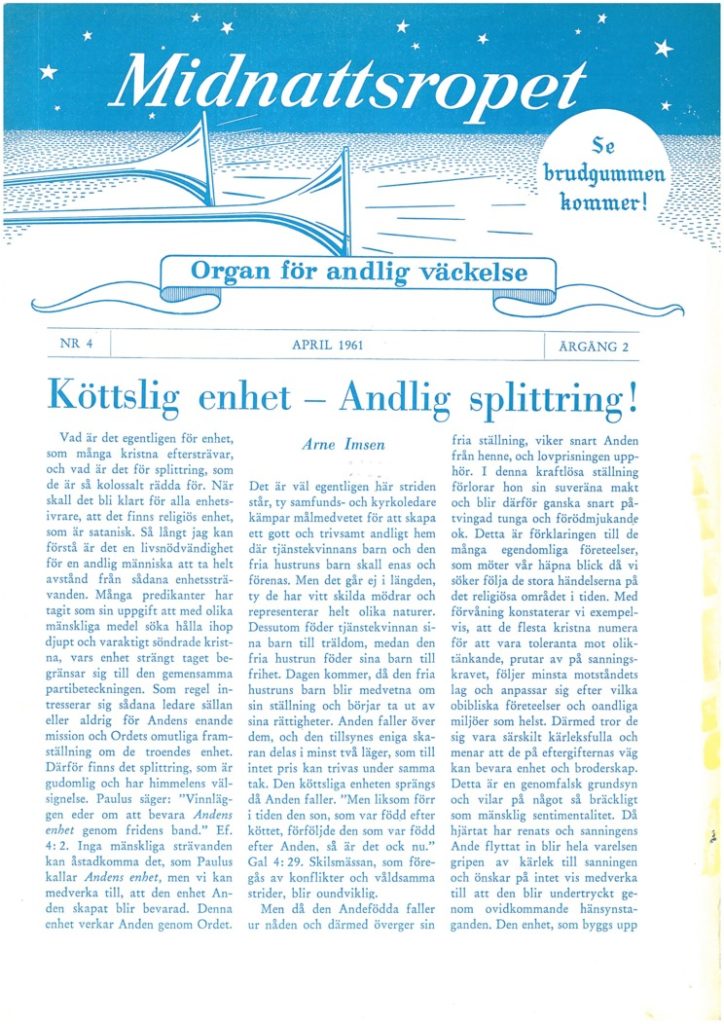 I detta nummer av Midnattsropet har vi givit särskilt stort utrymme åt det synnerligen aktuella ämnet de kristnas enhet. Eftersom det ofta, i synnerhet från pingströrelsens ledare, framhålles att vi är partisöndrare och därför skall uteslutas och isoleras eller vad man nu vill kalla det, kan det vara på sin plats att söka ge skäl för den egentliga orsaken till att vi underkastat oss denna behandling och valt att verka utanför den organiserade pingströrelsens domäner. Många av våra vänner på olika platser i landet har, efter det de varit med i våra möten och förnummit att Gud har verkat till själars frälsning, dop 1 helig Ande, helbrägdagörelse 0.s.v. gripits av tacksamhet och glädje för vad Gud utfört i deras och andras liv. Men efter en sådan erfarenhet har de utsatts för en synnerligen omild behandling. Andra har man sökt fånga med list eller smicker, men avsikten har varit en och densamma, nämligen att få de ”förvillade” att omvända sig och ta avstånd från det de själva har sett och förnummit Gud har gjort. Jag skall förtydliga dessa påståenden med ett exempel. Broder Verner Sällström, som tjänat Gud i pingströrelsen i omkring trettio år såsom evangelist och föreståndare, uteslöts ur Filadelfiaförsamlingen i Lindesberg därför att han bevistat och medverkat i två väckelsemöten, som hölls i en profan lokal på platsen. Före uteslutningen fick han besök av en grupp framstående pingstpredikanter. Dessa meddelade honom, att han automatiskt skulle bli blockerad om han icke tog avstånd från all fri verksamhet. Vår broder ansåg icke att’ han gjort något, som krävde att han gjorde avbön och blev därför utesluten ur Filadelfiaförsamlingen. Motivet för detta var att han deltagit i nämnda möten. Hade broder Sällström besökt eller medverkat i en annan av stadens många kyrkor, hade ingen sagt något om det. .Han kunde ha predikar i Vilken stats- eller frikyrka som helst utan att någon församlingsföreståndare gjort något för att varna, hindra eller utesluta honom. På platsen finns det många pingstvänner, som mer eller mindre regelbundet varit med i våra möten och även medverkat med bön och vittnesbörd, men de har aldrig hotats med uteslutning för det. Varför denna inkonsekvens? Var det synd i det ena fallet så måste det Väl också vara synd i det andra? Det är många som frågar sig hur ett sådant tillvägagångssätt är möjligt. Var det församlingsledningens avsikt att statuera ett- varnande exempel? Broder Sällström har sökt gemenskap’ hos oss, och så långt vi har kunnat utröna så är han bevarad i Kristus och lever och verkar med samma mål som förr. Man utesluter och tar avstånd ifrån vänner, som har en enda passion, att leva för Gud och tjäna honom, men behåller avfälliga och ljumma kristna, därför att de är partitrogna. Exemplet kunde mångfaldigas, men det kan räcka med detta tills vidare. Inom pingströrelsen har det skett en nästan otrolig förskjutning från fri Väckelserörelse med andesmorda vittnen och församlingar till sterotyp församlingsinstitution med ett dominerande predikantVälde, där den enskilde alltför ofta är bunden på händer och fötter av ett partimedvetet kollektiv. Den frihet, som från början kännetecknade denna rörelse har gått förlorad. Skaror av pingstvänner måste idag erkänna detta ödesdigra faktum. I detta nummer kan våra läsare ta del av en artikel, som stod i Evangelii Härold för över trettio år sedan. Den syn på allians och ekumenik som med skärpa förfäktas i denna uppsats har undergått en total förändring. I varje fall praktiseras något helt annat idag. Hur kan det vara möjligt’ att andedöpta vittnen och kyrkans statsanställda teologer kan ha ett så förtroligt samarbete? Pastor Lewi Pethrus framträder ju själv ofta tillsammans med statskyrkans dignitärer. Sådant skulle icke vara möjligt utan Våldsamma kollisioner om allt vore som det var från begynnelsen. ”Om så vore, att jag byggde upp igen detta samma som jag redan har brutit ned, då bevisade jag därmed, att jag var en överträdare”. Gal 22I8. Arne Imsen.