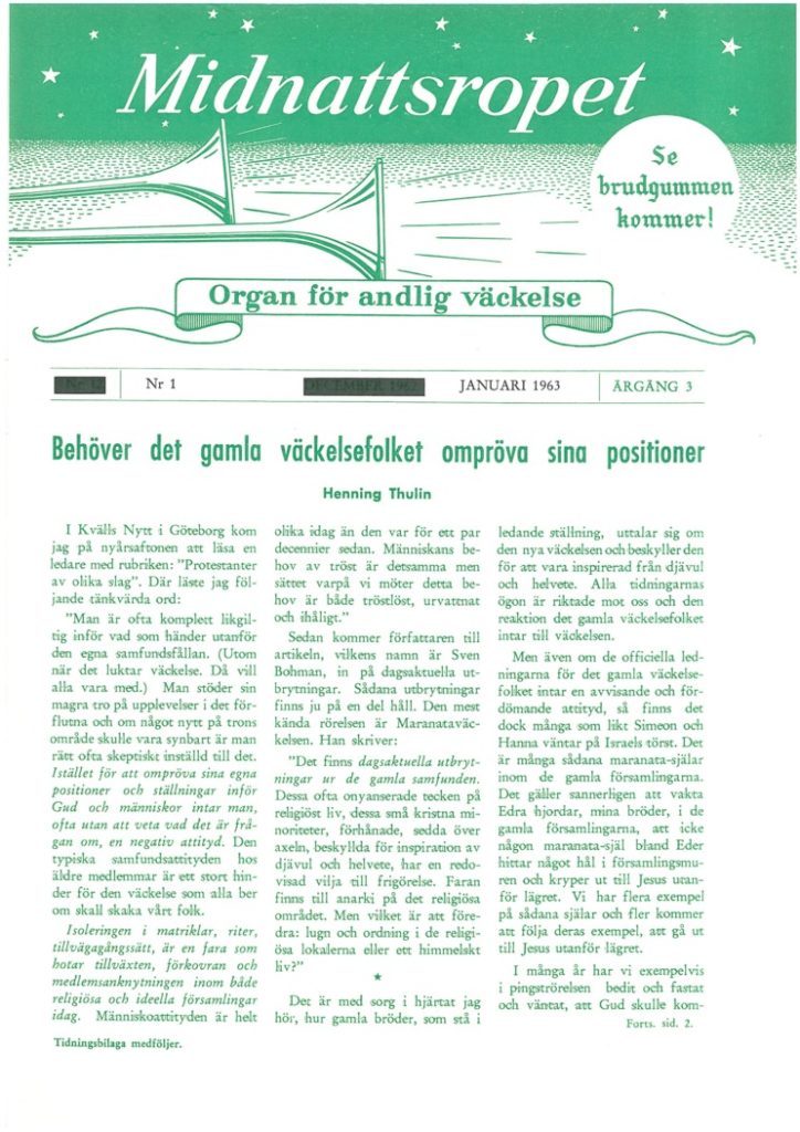 För några månader sedan upplevde jag Guds kraft till frälsning och helbrågdagörelse. Jag hade varit avfålling i 5 år och under dessa år var det mycket mörkt. Spriten kom in i mitt liv och jag var mycket olycklig. Och som följd av detta vek sömnen från mig. Jag började då ta sömntabletter och det i sådan möngd att jag blev tablettförgifted och fick tidtals vistas på ett par konvalecenthem. Men Gud lämnad emig inte. Jag bad till Gud emellanåt under denna tid, men blev inte löst. Men, ära Vlare Gud, förlossningens stund kom. Efter det jag hade kommit hem från Röda Korsets konvalecenthem gick jag till ett möte i IOGT som Maranata hade. En broder kände Andens ledning och kom och talade med mig och jag gick då fram för förbön. Och då upplevde jag hur Guds kraft gick igenom mig från topp till tå och jag blev frälst och helbrågdagjord i ett ögonblick. Och sedan har jag varit fri genom Guds nåd och sovit gott om nätterna. All ‘ara till denne underbare Frålsare. Och min längtan år nu att vara där elden brinner och tjäna Gud i alla mina livsdagar.