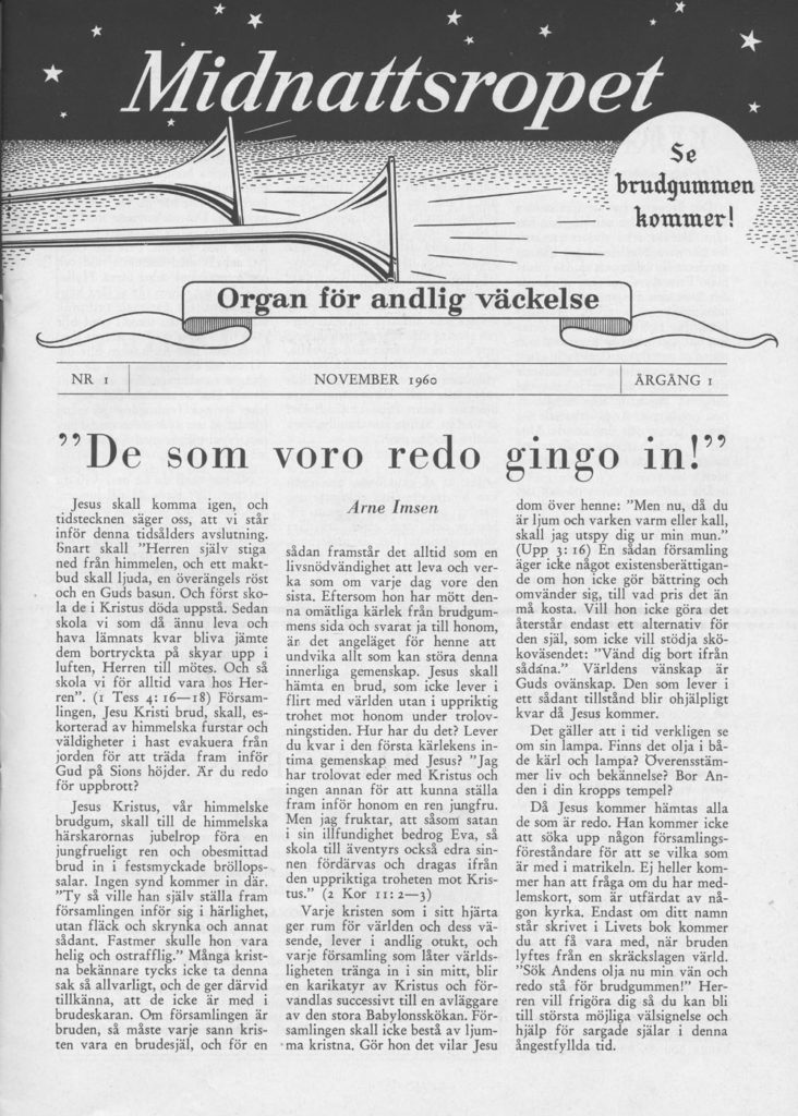 Det är med förundran och tacksamhet vi blickar tillbaka på de femtio år som gått sedan tidningen Midnattsropet började ges ut i vårt land. Det var i november 1960 första numret trycktes i ett tusen exemplar. På nästa sida återges ett facsimil av framsidan, med trumpeter och ett uppfordrande maranatarop: Se, brudgummen kommer! Därunder finns ledaren, som också har en mycket väckande rubrik: De som voro redo, gingo in.