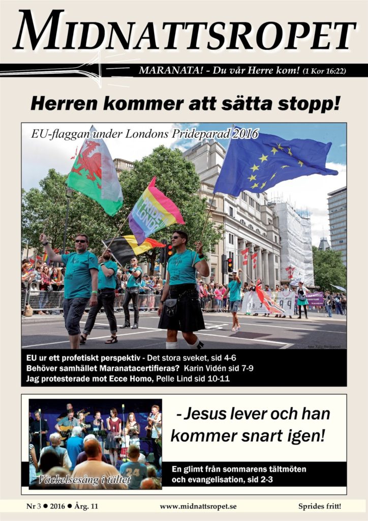 Med de orden inledde Arne Imsen en ledare publicerad i Midnattsropet året innan Sverige gick med i EU. Idag har utvecklingen gått mycket längre och vi ser ett EU, som inte bara tagit form, men som också är på väg att falla samman exakt på det sätt som profeten Daniel beskriver när han får se hur den mäktiga bildstod som representerar världsrikena pulveriseras och till slut försvinner. Dess yttre glans och makt var bara en förrädisk yta och kunde omöjligt bestå. EU är ett resultat av detta antikristliga rike och kommer att när tiden är inne rasa samman i sodomitisk korruption och ondska. Det räckte med att Storbritannien röstade om att lämna EU för att världsekonomin skulle hamna i kris. Brexit förmodas ge ekonomiskt förödande dominoeffekter framöver.