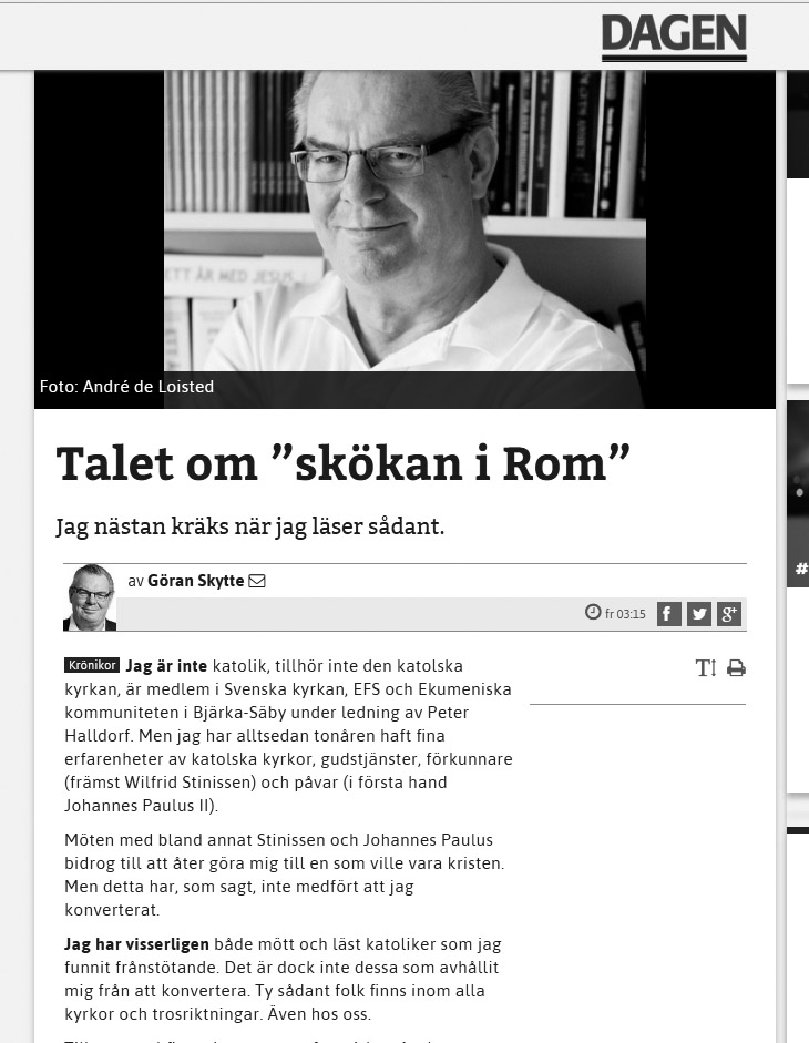Göran Skytte ondgör sig i tidningen Dagen över att Midnattsropet varnar för katolicismen. Utan omsvep skriver han om hur illa han tycker om Midnattsropets publikation om påveväldet och att namn som Spurgeon, Barratt, Lewi Pethrus och NP Wetterlund citeras. Tydligen nådde väckelsepionjärernas budskap fram. Här följer ett utdrag ur hans krönika: